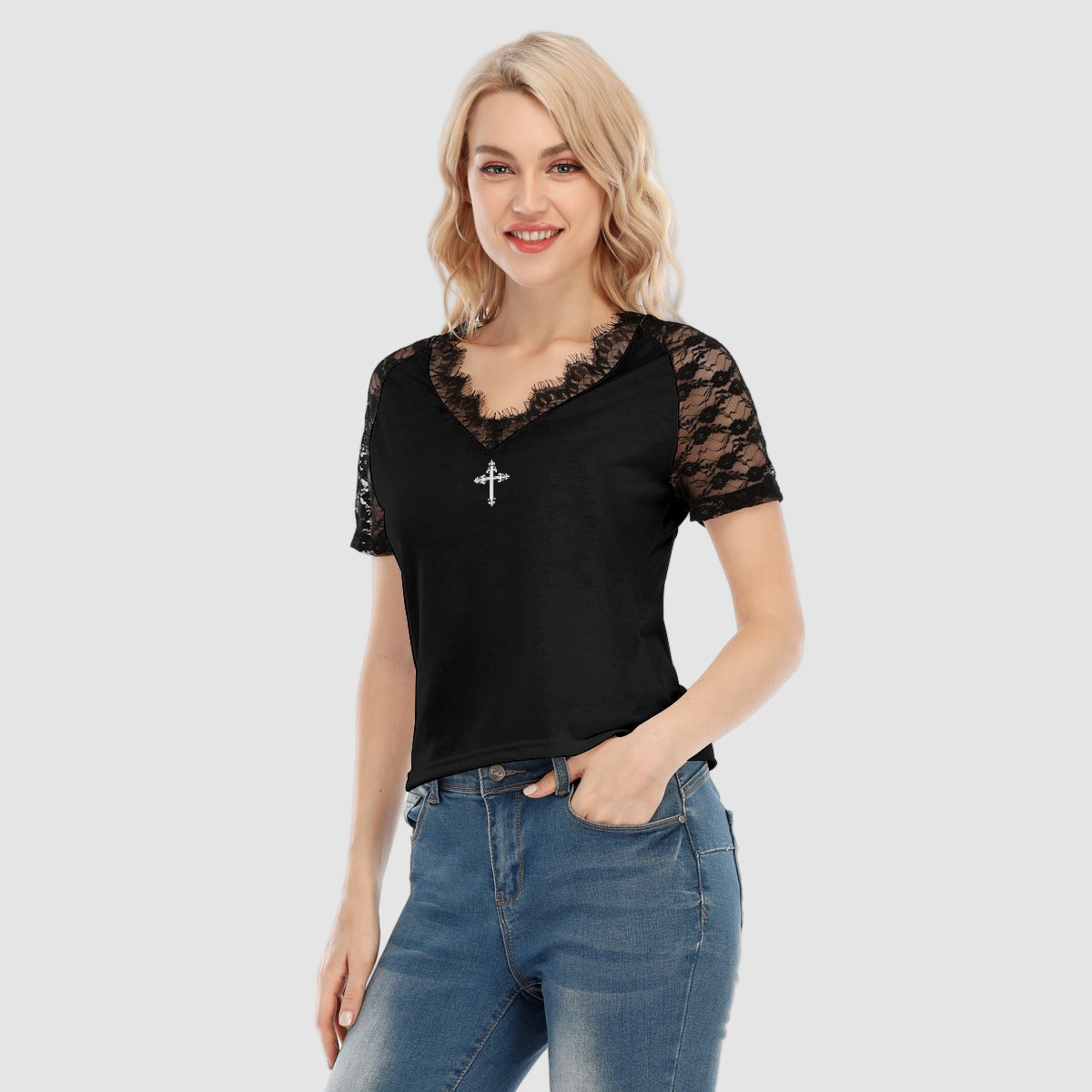 - Sort blonde på kanterne, V-udskæring
