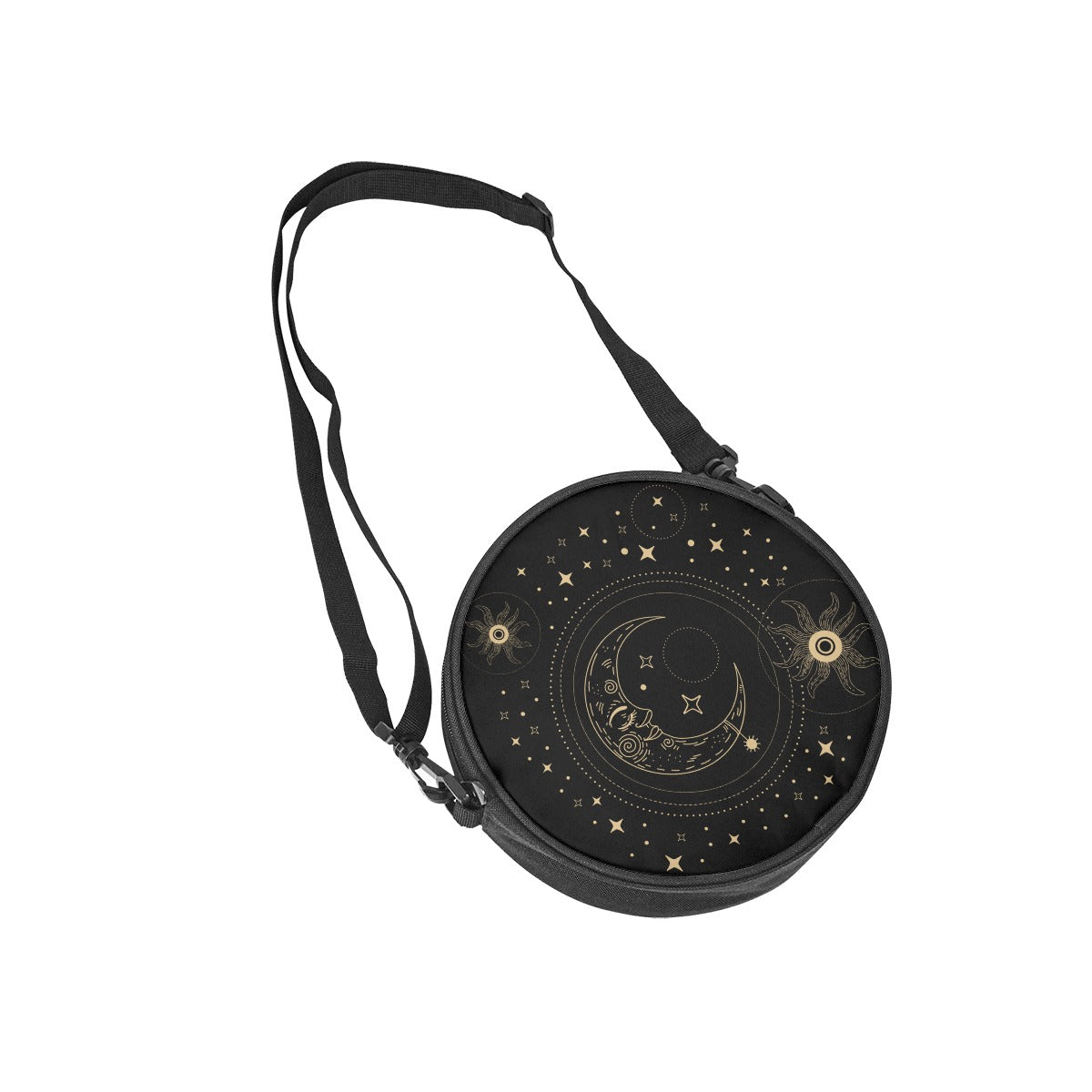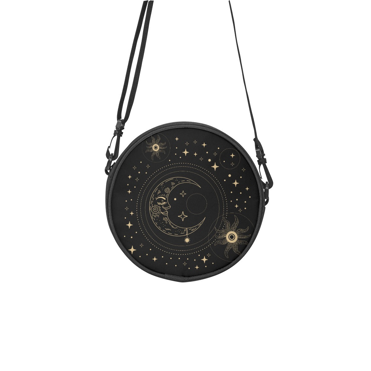 Sort rund taske med måne- og solmotiv i boho-gotisk stil